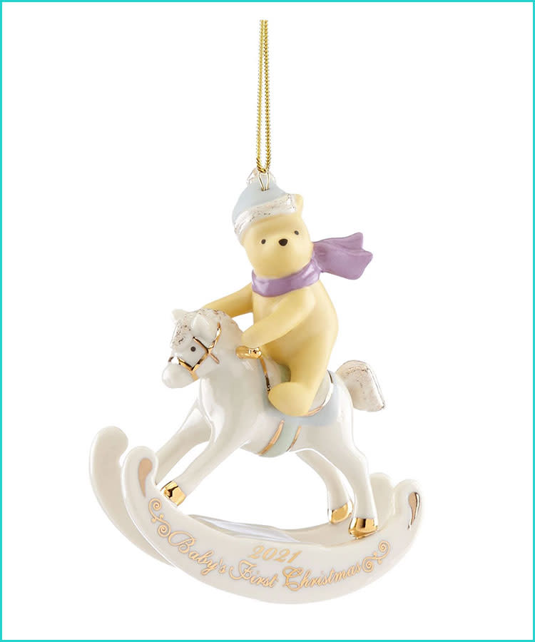 Speaking of heirlooms, at that place's nix quite like getting babe'due south first Christmas ornamentation from Lenox. This piece has Disney'southward Winnie The Pooh sitting atop an ivory porcelain and 24K gold-tone rocking chair that is commemorative of 2021.
