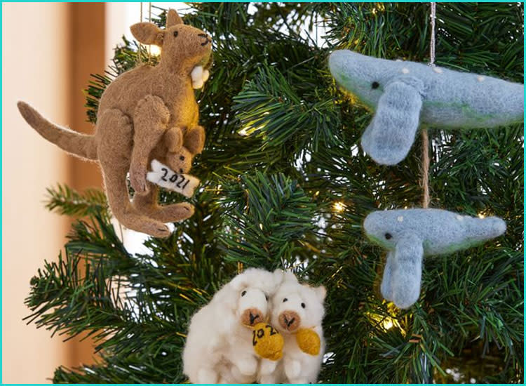 How about a menagerie of felt ornaments? These adorable animals take been handmade in a Fair Merchandise factory in Nepal, making them a truly unique add-on to your holiday decor. Choose from a range of fuzzy friends including a whale, kangaroo and twin lambs.