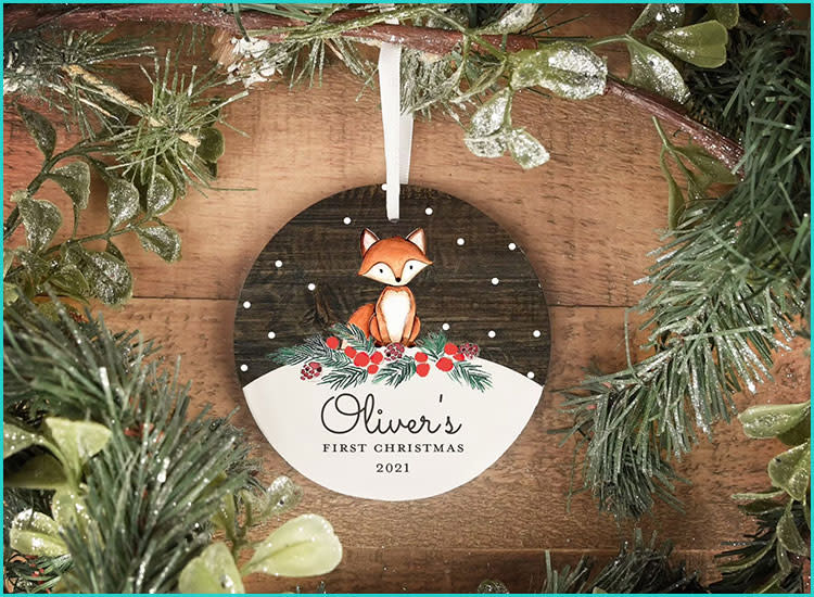 Buy it: Mooseberry Design Co. Personalized Woodland Fox and Snowflakes Infant'southward First Christmas Ornament, starting from $24, Etsy.com