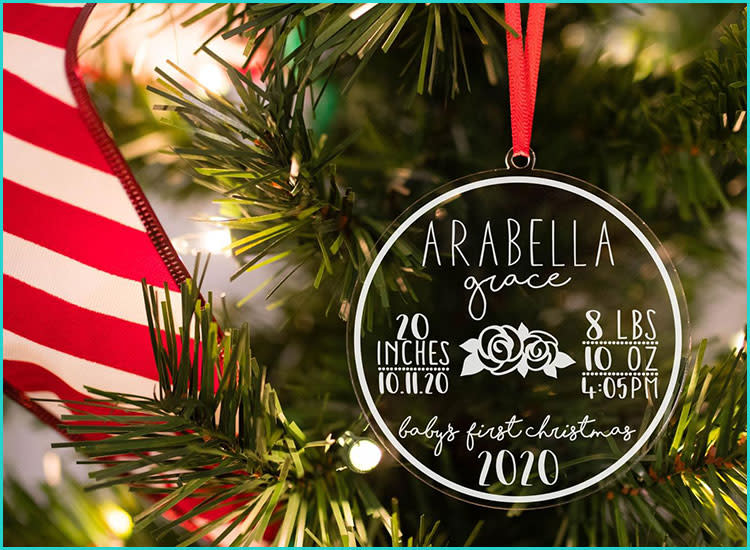 Looking for something on trend for 2021? Look no further than this lucite design ornament. This gimmicky pick can be customized with all of baby's birth stats.